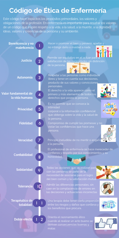 Este código hace explícitos los propósitos primordiales, los valores y obligaciones de la profesión. En enfermería es importante para resaltar los valores de un código que inspire respeto a la vida, a la salud, a la muerte, a la dignidad, ideas, valores y creencias de la persona y su ambiente.