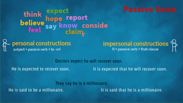 Active: People claim that he left the country two months ago. Passive 1: It’s claimed that he left the country two months ago. Passive 2: He is claimed to have left the country two months ago.