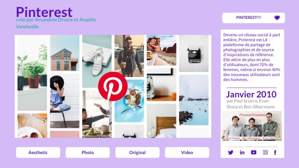 Devenu un réseau social à part entière, Pinterest est la plateforme de partage de photographies et de source d’inspirations de référence. Elle attire de plus en plus d’utilisateurs, dont 70% de femmes, même si environ 40% des nouveaux utilisateurs sont des hommes.