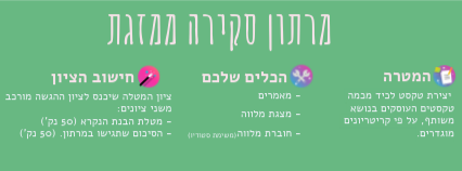 ציון המטלה שיכנס לציון ההגשה מורכב משני ציונים: - מטלת הבנת הנקרא (50 נק') - הסיכום שתגישו במרתון. (50 נק')
