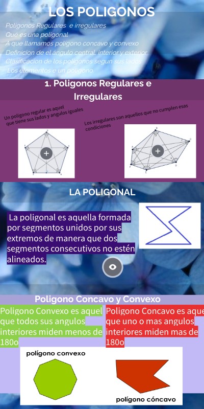 Poligonos Regulares e irregularesQué es una poligonal A que llamamos polígono concavo y convexo Definicion de el ángulo central, interior y exterior Clasificacion de los poligonos segun sus lados Los elementos e un poligono.