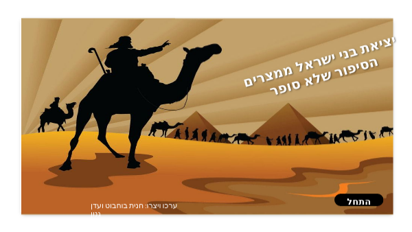 ברוכים הבאים לחדר הבריחה של יציאת מצרים אם חשבתם שלברוח ממצרים זה קל, אז חשבו שוב .מפני שלפרעה תכנית אחרת שלמצרים תגרום לכם לשוב בתכנית עשר מכות שיעכבו אתכם בדרך לארץ המובטחת ? ומה תפקידכם להתחמק מהמכות, לענות על שאלות בצורה הטובה והמוצלחת תשובה נכונה תזכה אתכם במספר סודי .שלבסוף ירכיב את קוד היציאה הבלעדי את הקוד עליכם לומר למשה בסוד .ואם צדקתם, הרי לכם-פיצחתם את הקוד מהרו! לרשותכם 45 דקות בלבד !אחרת תישארו במשך כל חייכם במצרים לבד ????מוכנים