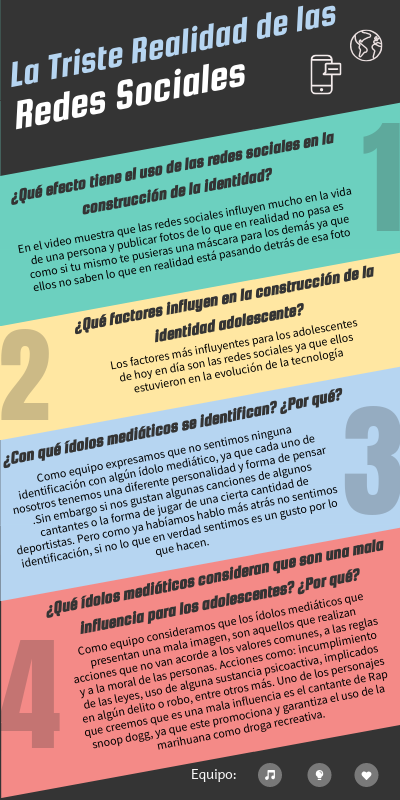 Como equipo expresamos que no sentimos ninguna identificación con algún ídolo mediático, ya que cada uno de nosotros tenemos una diferente personalidad y forma de pensar .Sin embargo si nos gustan algunas canciones de algunos cantantes o la forma de jugar de una cierta cantidad de deportistas. Pero como ya habíamos hablo más atrás no sentimos identificación, si no lo que en verdad sentimos es un gusto por lo que hacen.