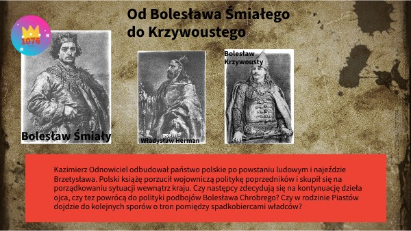 Kazimierz Odnowiciel odbudował państwo polskie po powstaniu ludowym i najeździe Brzetysława. Polski książę porzucił wojowniczą politykę poprzedników i skupił się na porządkowaniu sytuacji wewnątrz kraju. Czy następcy zdecydują się na kontynuację dzieła ojca, czy tez powrócą do polityki podbojów Bolesława Chrobrego? Czy w rodzinie Piastów dojdzie do kolejnych sporów o tron pomiędzy spadkobiercami władców?