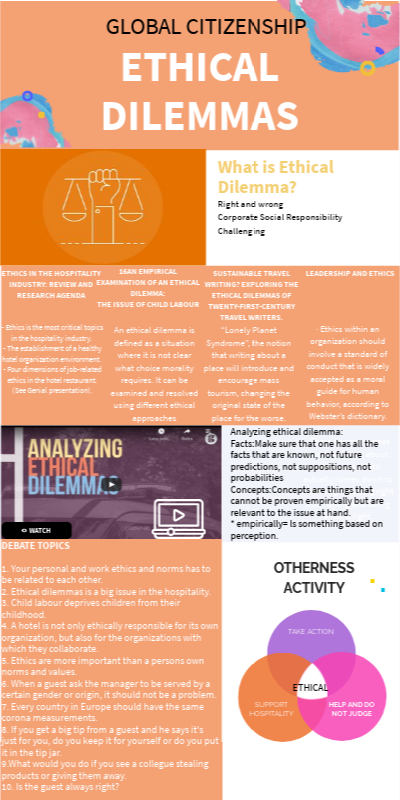 DEBATE TOPICS 1. Your personal and work ethics and norms has to be related to each other. 2. Ethical dilemmas is a big issue in the hospitality. 3. Child labour deprives children from their childhood. 4. A hotel is not only ethically responsible for its own organization, but also for the organizations with which they collaborate. 5. Ethics are more important than a persons own norms and values. 6. When a guest ask the manager to be served by a certain gender or origin, it should not be a problem. 7. Every country in Europe should have the same corona measurements. 8. If you get a big tip from a guest and he says it's just for you, do you keep it for yourself or do you put it in the tip jar. 9.What would you do if you see a collegue stealing products or giving them away. 10. Is the guest always right?