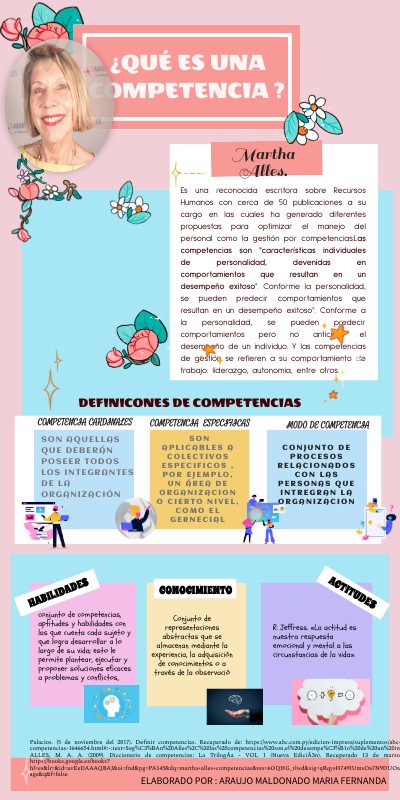 Palacios. (5 de noviembre del 2017). Definir competencias. Recuperado de: https://www.abc.com.py/edicion-impresa/suplementos/abc-revista/definir-competencias-1646654.html#:~:text=Seg%C3%BAn%20Alles%2C%20las%20competencias%20son,el%20desempe%C3%B1o%20de%20un%20individuo.. ALLES, M. A. A. (2009). Diccionario de competencias: La TrilogÃa - VOL 1 (Nueva EdiciÃ3n). Recuperado 13 de marzo de 2021, de https://books.google.es/books?hl=es&lr=&id=uvEeDAAAQBAJ&oi=fnd&pg=PA145&dq=martha+alles+competencias&ots=6OQHG_tlwd&sig=qRqysH749IUmsOa7N9DUOaqCaeg#v=onepage&q&f=false