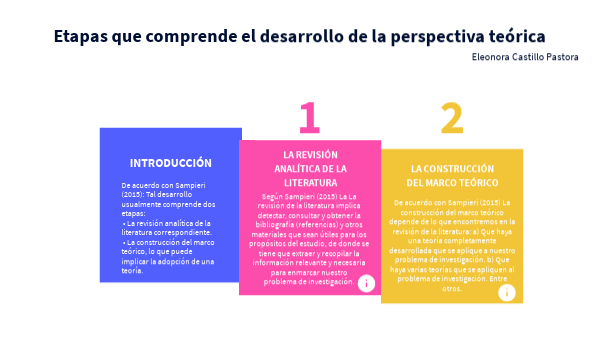 De acuerdo con Sampieri (2015): Tal desarrollo usualmente comprende dos etapas: • La revisión analítica de la literatura correspondiente. • La construcción del marco teórico, lo que puede implicar la adopción de una teoría.