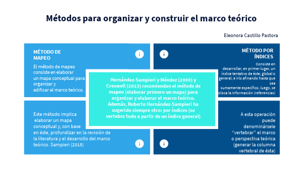 Hernández-Sampieri y Méndez (2009) y Creswell (2013) recomiendan el método de mapeo (elaborar primero un mapa) para organizar y elaborar el marco teórico. Además, Roberto Hernández-Sampieri ha sugerido siempre otro: por índices (se vertebra todo a partir de un índice general)