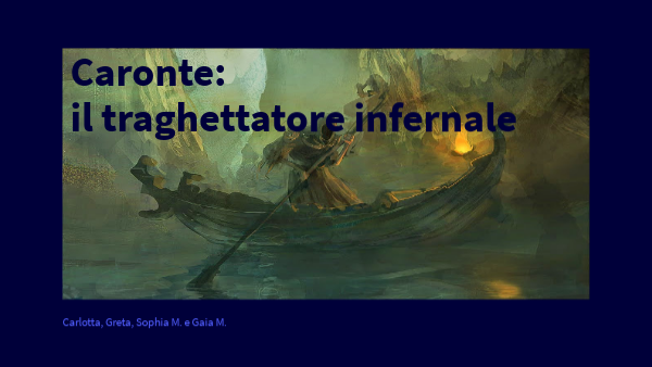 DescrizioneCaronte, traghettatore Infernale, (dal greco antico ferocia illuminata), figlio dell' Erebo e della notte, trasporta sulla sua barca le anime dei dannati, attraversando il fiume Acheronte, che significa "fiume del dolore" per far arrivare le anime a destinazione: L'Inferno