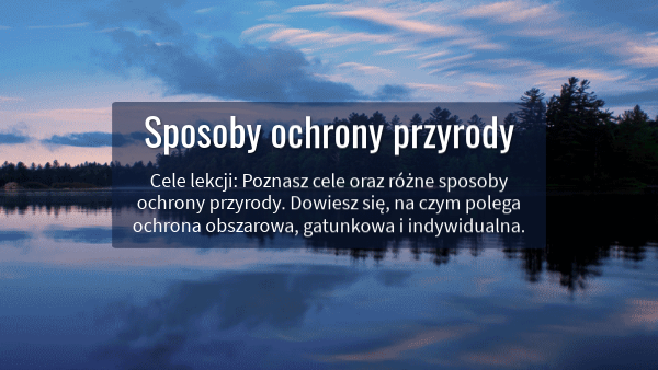 Cele lekcji: Poznasz cele oraz różne sposoby ochrony przyrody. Dowiesz się, na czym polega ochrona obszarowa, gatunkowa i indywidualna.