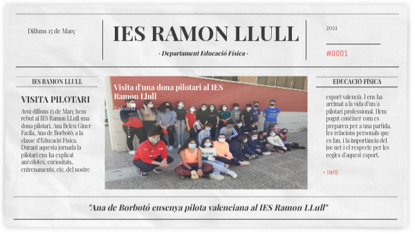 Avui dilluns 15 de Març hem rebut al IES Ramon LLull una dona pilotari, Ana Belen Giner Facila, Ana de Borbotó; a la classe d'Educació Física. Durant aquesta jornada la pilotari ens ha explicat anècdotes, curiositats, entrenaments, etc. del nostre
