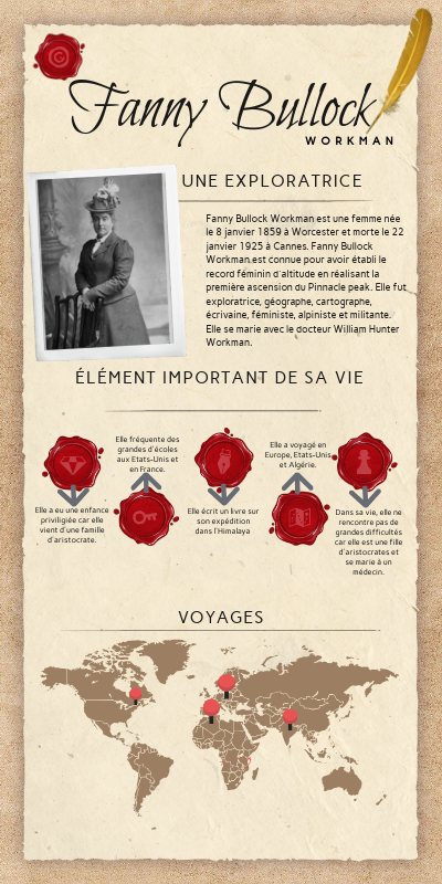 Fanny Bullock Workman est une femme née le 8 janvier 1859 à Worcester et morte le 22 janvier 1925 à Cannes. Fanny Bullock Workman est connue pour avoir établi le record féminin d'altitude en réalisant la première ascension du Pinnacle peak. Elle fut exploratrice, géographe, cartographe, écrivaine, féministe, alpiniste et militante. Elle se marie avec le docteur William Hunter Workman.