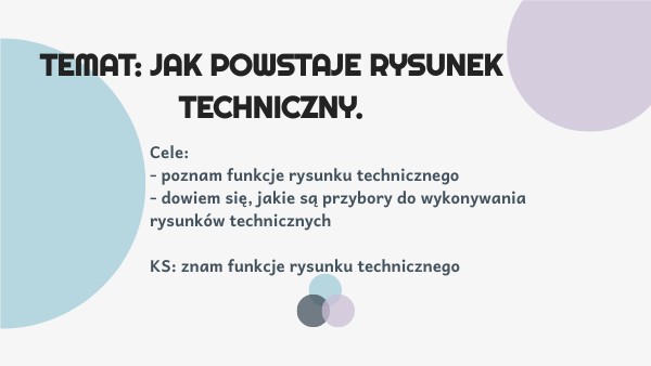 Cele:- poznam funkcje rysunku technicznego - dowiem się, jakie są przybory do wykonywania rysunków technicznych KS: znam funkcje rysunku technicznego