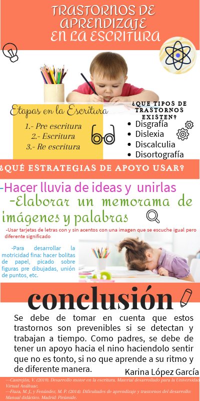 ---Castrejón, V. (2019). Desarrollo motor en la escritura. Material desarrollado para la Universidad Virtual Anáhuac. ---Fiuza, M. J., y Fenández, M. P. (2014). Dificultades de aprendizaje y trastornos del desarrollo: Manual didáctico. Madrid: Pirámide.