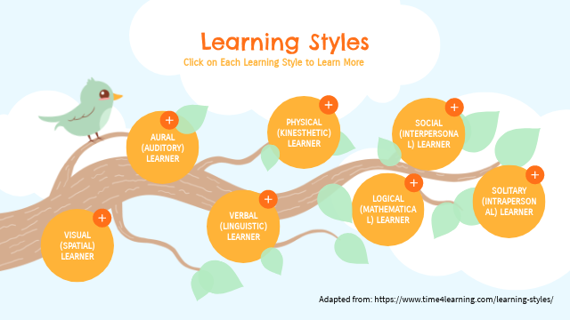 These learners are all about the sense of touch and learn best when they can do rather than see or hear. Physical activities and sports play a big part in these student’s lives. Focus on sensations, both physical and descriptive. Remember that writing and drawing diagrams are also physical activities.