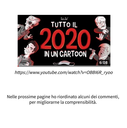 Il 2020 è stato funestato da questa pandemia, eppure il video riesce a trattarlo con ironia giusta e tatto incredibile. Davvero. Applausi a Dan e Dav, l'asticella va sempre più su! Torniamo a noi... l'ho fatto l'anno scorso, quel bimbo che irrispettosamente dava del "boomer" all'anno precedente si è mostrato per quel che è... quindi.. vediamo di riepilogare: