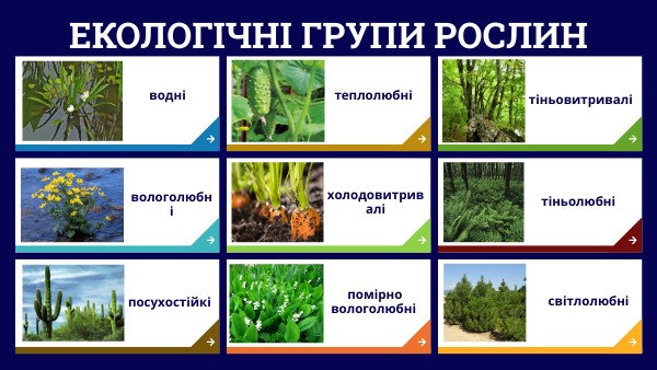 - Тіньолюбні рослини розвиваються за умов недостатнього освітлення і не терплять яскравого світла.