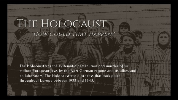 The Holocaust was the systematic persecution and murder of six million European Jews by the Nazi German regime and its allies and collaborators. The Holocaust was a process that took place throughout Europe between 1933 and 1945.