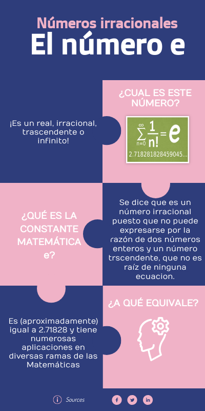 Es (aproximadamente) igual a 2.71828 y tiene numerosas aplicaciones en diversas ramas de las Matemáticas