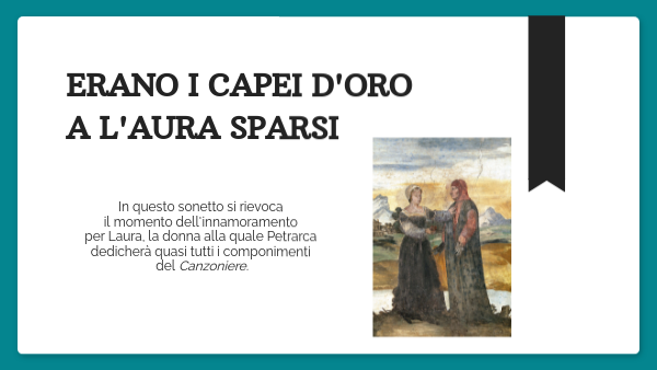 Erano i capei d’oro a l’aura sparsi A che ’n mille dolci nodi gli avolgea, B e ’l vago lume oltra misura ardea B 4 di quei begli occhi ch’or ne son sì scarsi; A e ’l viso di pietosi color farsi, A non so se vero o falso, mi parea: B i’ che l’esca amorosa al petto avea, B 8 qual meraviglia se di sùbito arsi? A