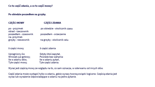 Co to część zdania, a co to część mowy? Po obiedzie poszedłem na grzyby. CZĘŚCI MOWY CZĘŚCI ZDANIA po - przyimek po obiedzie - okolicznik czasu obiad - rzeczownik poszedłem - czasownik poszedłem - orzeczenie na- przyimek grzyby - rzeczownik na grzyby - okolicznik celu 5 części mowy 3 części zdania Upragniony ów Gdyby ktoś zapytał, Wniosek już gotowy; Powiedz bez wahania:Ile w zdaniu słów, Ile w zdaniu pytań,Tyle części mowy. Tyle części zdania. Wyraz jest częścią mowy ze względu na to, co sam oznacza, w oderwaniu od innych słów. Część zdania może wystąpić tylko w zdaniu, gdzie wyrazy tworzą związki logiczne. Częścią zdania jest wyraz lub wyrażenie odpowiadające w zdaniu na jedno pytanie.