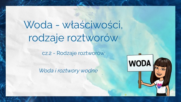 Woda jest substancją zbudowaną z cząsteczek. Każdą cząsteczkę tworzą dwa atomy wodoru połączone z jednym atomem tlenu..