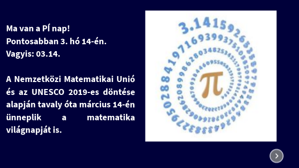 Ma van a PÍ nap!Pontosabban 3. hó 14-én. Vagyis: 03.14. A Nemzetközi Matematikai Unió és az UNESCO 2019-es döntése alapján tavaly óta március 14-én ünneplik a matematika világnapját is.