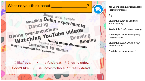 Ask your peers questions about their preferences: E.g.: Student A: What do you think about reading? Student B: I really enjoy reading. What do you think about giving presentations? Student A: I really dread giving presentations. What do you think about...?