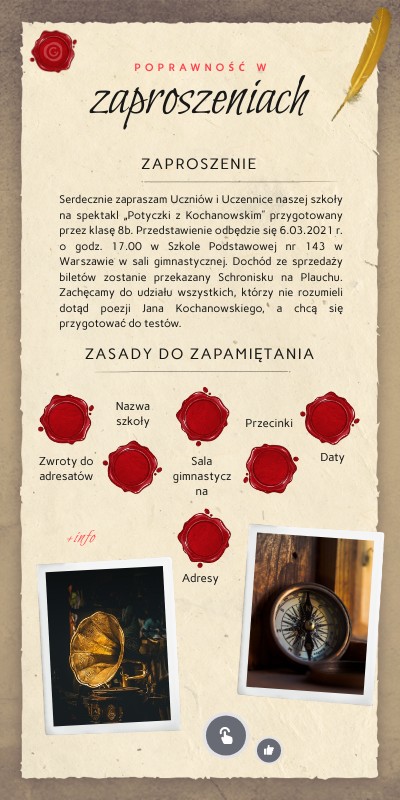 Serdecznie zapraszam Uczniów i Uczennice naszej szkoły na spektakl „Potyczki z Kochanowskim” przygotowany przez klasę 8b. Przedstawienie odbędzie się 6.03.2021 r. o godz. 17.00 w Szkole Podstawowej nr 143 w Warszawie w sali gimnastycznej. Dochód ze sprzedaży biletów zostanie przekazany Schronisku na Paluchu. Zachęcamy do udziału wszystkich, którzy nie rozumieli dotąd poezji Jana Kochanowskiego, a chcą się przygotować do testów. XYZ