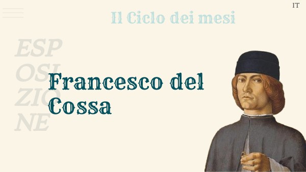 Tra il 1469 e il 1470 Francesco del Cossa realizza una parte del Ciclo dei Mesi in Palazzo Schifanoia. Questo era una delle “delizie” dei Signori di Ferrara, luogo di ritrovo mondano (il nome significa “schivar la noia”). La superficie dipinta si sviluppava lungo le quattro pareti e rivestiva complessivamente 540 metri quadrati, configurando uno dei più estesi cicli pittorici profani del Rinascimento. Già nella prima metà del Settecento una parte significativa degli affreschi era andata perduta a causa delle cattive condizioni dell’edificio, che era stato utilizzato come manifattura di tabacchi e granaio; verso la fine del secolo la decorazione era del tutto scomparsa sotto uno strato di intonaco. Oggi sono visibili soltanto sette dei dodici scomparti originari, corrispondenti ai Mesi da Marzo a Settembre, che si sviluppano lungo le pareti est e nord.