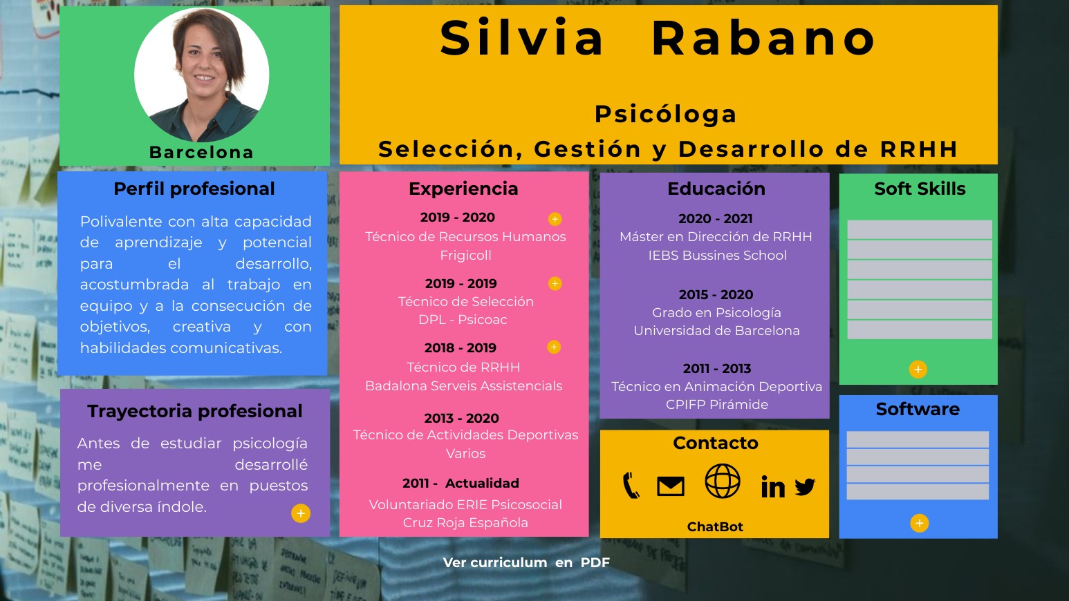 En 2015 me trasladé a Barcelona, para estudiar psicología y encaminar mi carrera profesional hacia la gestión y desarrollo de RRHH. Actualmente estoy cursando un Máster en Dirección de Recursos Humanos 4.0 . Me mantengo en constante desarrollo, aprendiendo sobre nuevas tecnologías y buscando su aplicabilidad en la gestión del capital humano.