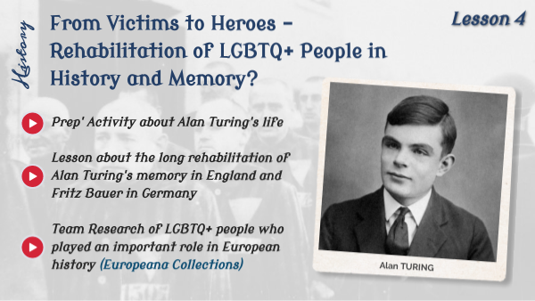 Prep' Activity about Alan Turing's life Lesson about the long rehabilitation of Alan Turing's memory in England and Fritz Bauer in Germany Team Research of LGBTQ+ people who played an important role in European history (Europeana Collections)