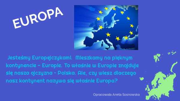 Jesteśmy Europejczykami. Mieszkamy na pięknym kontynencie - Europie. To właśnie w Europie znajduje się nasza ojczyzna – Polska. Ale, czy wiesz dlaczego nasz kontynent nazywa się właśnie Europa?