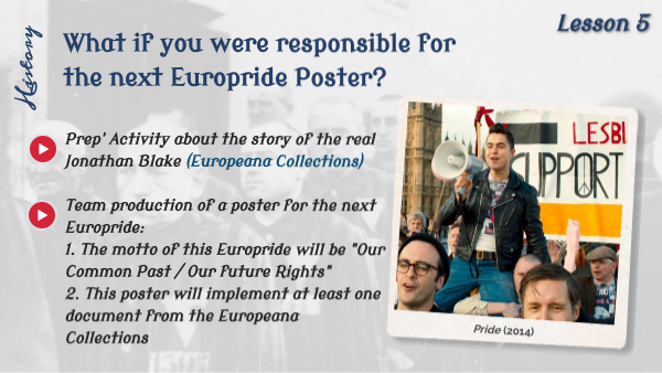 Prep' Activity about the story of the real Jonathan Blake (Europeana Collections) Team production of a poster for the next Europride: 1. The motto of this Europride will be "Our Common Past / Our future Rights" 2. This poster will implement at least one document from the Europeana Collections