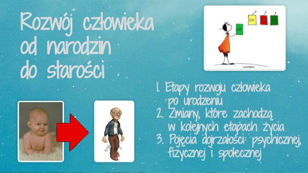 1. Etapy rozwoju człowieka po urodzeniu 2. Zmiany, które zachodzą w kolejnych etapach życia 3. Pojęcia dojrzałości: psychicznej, fizycznej i społecznej