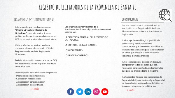Este proyecto que nombramos como "Oficina Virtual del Registro de Licitadores" , permite realizar toda su gestión en forma virtual, resolviendo en un 95% todos los tramites inherentes al mismo. .Dichos trámites se realizan en línea conforme el nuevo decreto año 2021 del Reglamento General del Registro de Licitadores. Toda la información reviste caracter de DDJJ. Por este motivo sólo se ingresan los datos necesarios para: - Identificación del Aministrador Legitimado - Inscripcion de la constructora - Calificación y Habilitación - Actualización para renovación - Actualización extraordinaria.