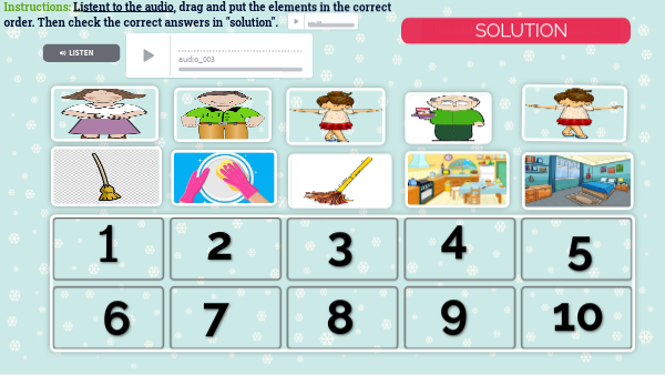 Instructions: Listent to the audio and order the pictures.Drag and put the elements in the correct order. Then check the correct answers in "solution".