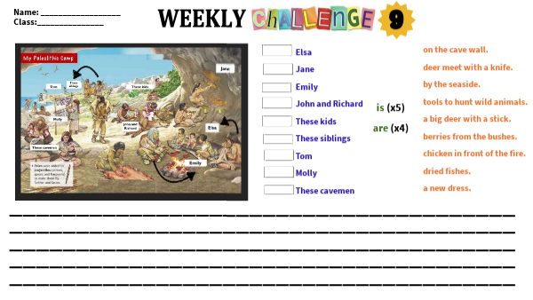 on the cave wall.deer meet with a knife. by the seaside. tools to hunt wild animals. a big deer with a stick. berries from the bushes. chicken in front of the fire. dried fishes. a new dress.