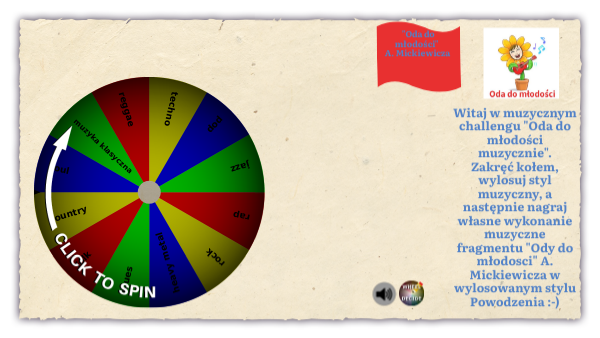 Witaj w muzycznym challengu "Oda do młodości muzycznie". Zakręć kołem, wylosuj styl muzyczny, a następnie nagraj własne wykonanie muzyczne fragmentu "Ody do młodosci" A. Mickiewicza w wylosowanym stylu Powodzenia :-)