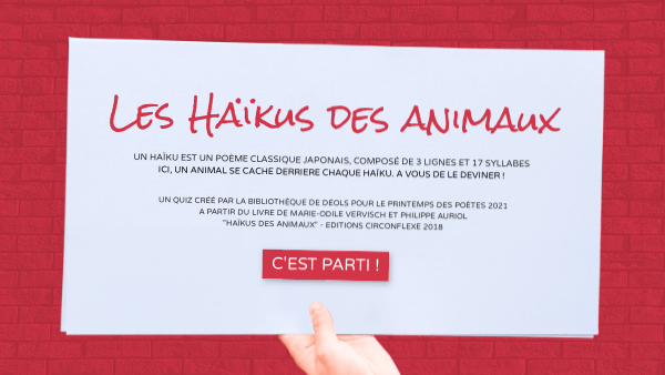 un quiz créé par la bibliothèque de Déols pour le printemps des poètes 2021 a partir du livre de Marie-Odile Vervisch et Philippe Auriol "Haïkus des animaux" - editions Circonflexe 2018