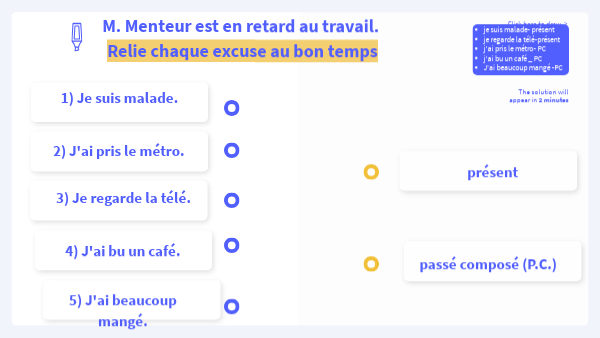 M. Menteur est en retard au travail. Relie chaque excuse au bon temps