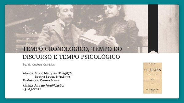 • Outono de 1875 -> Afonso e Carlos da Maia instalam-se no Ramalhete. • Analepse -> Recuo até 1820. • Fim da analepse -> Do outono de 1875 ao fim de 1876 -> Vida social -> de Carlos (crónica de costumes, em vários «episódios»); amor incestuoso entre Carlos e Maria Eduarda. • 1877 -> Viagem de Carlos e Ega «nos primeiros dias do ano novo». • 1878 -> Regresso de Ega a Portugal («ano e meio» depois de 1877). • 1887 -> Regresso de Carlos a Lisboa e passeio final.