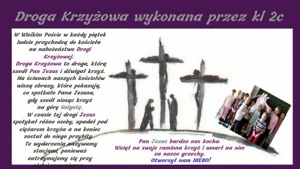 W Wielkim Poście w każdy piątek ludzie przychodzą do kościoła na nabożeństwo Drogi Krzyżowej. Droga Krzyżowa to droga, którą szedł Pan Jezus i dźwigał krzyż. Na ścianach naszych kościołów wiszą obrazy, które pokazują, co spotkało Pana Jezusa, gdy szedł niosąc krzyż na górę Golgotę. W czasie tej drogi Jezus spotykał różne osoby, upadał pod ciężarem krzyża a na koniec został do niego przybity. Te wydarzenia nazywamy stacjami, ponieważ zatrzymujemy się przy nich i rozważamy. Jest ich 14.