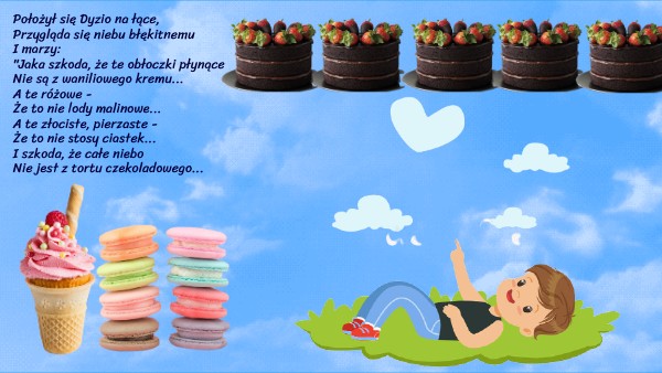 Położył się Dyzio na łące, Przygląda się niebu błękitnemu I marzy: "Jaka szkoda, że te obłoczki płynące Nie są z waniliowego kremu... A te różowe - Że to nie lody malinowe... A te złociste, pierzaste - Że to nie stosy ciastek... I szkoda, że całe niebo Nie jest z tortu czekoladowego...