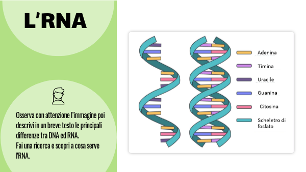 Osserva con attenzione l’immagine poi descrivi in un breve testo le principali differenze tra DNA ed RNA.Fai una ricerca e scopri a cosa serve l'RNA.