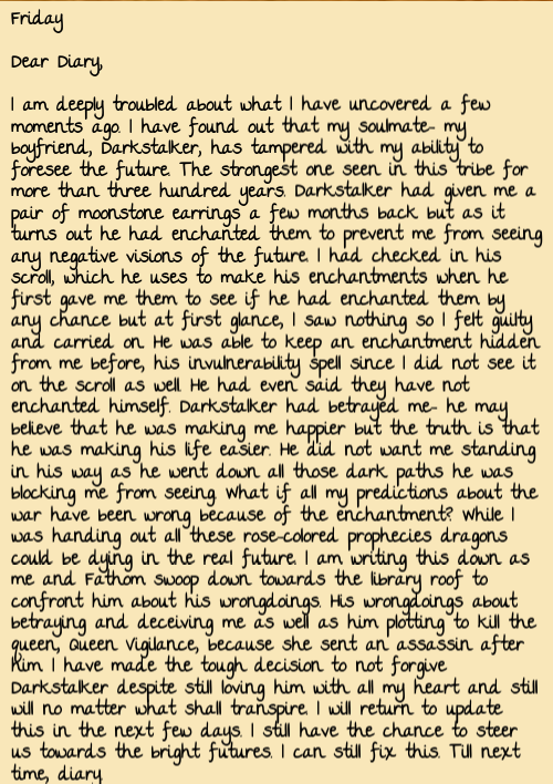 Friday Dear Diary, I am deeply troubled about what I have uncovered a few moments ago. I have found out that my soulmate- my boyfriend, Darkstalker, has tampered with my ability to foresee the future. The strongest one seen in this tribe for more than three hundred years. Darkstalker had given me a pair of moonstone earrings a few months back but as it turns out he had enchanted them to prevent me from seeing any negative visions of the future. I had checked in his scroll, which he uses to make his enchantments when he first gave me them to see if he had enchanted them by any chance but at first glance, I saw nothing so I felt guilty and carried on. He was able to keep an enchantment hidden from me before, his invulnerability spell since I did not see it on the scroll as well. He had even said they have not enchanted himself. Darkstalker had betrayed me- he may believe that he was making me happier but the truth is that he was making his life easier. He did not want me standing in his way as he went down all those dark paths he was blocking me from seeing. What if all my predictions about the war have been wrong because of the enchantment? While I was handing out all these rose-colored prophecies dragons could be dying in the real future. I am writing this down as me and Fathom swoop down towards the library roof to confront him about his wrongdoings. His wrongdoings about betraying and deceiving me as well as him plotting to kill the queen, Queen Vigilance, because she sent an assassin after him. I have made the tough decision to not forgive Darkstalker despite still loving him with all my heart and still will no matter what shall transpire. I will return to update this in the next few days. I still have the chance to steer us towards the bright futures. I can still fix this. Till next time, diary.