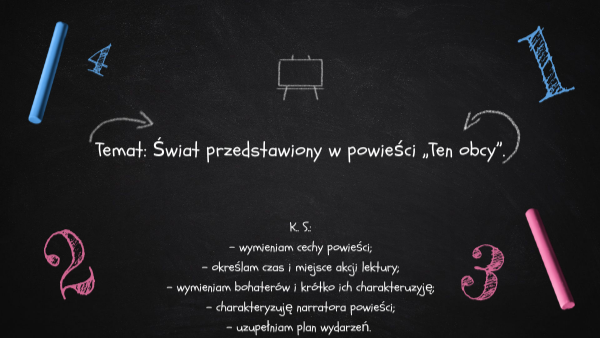 K.. S.: - wymieniam cechy powieści; - określam czas i miejsce akcji lektury; - wymieniam bohaterów i krótko ich charakteruzyję; - charakteryzuję narratora powieści; - uzupełniam plan wydarzeń.