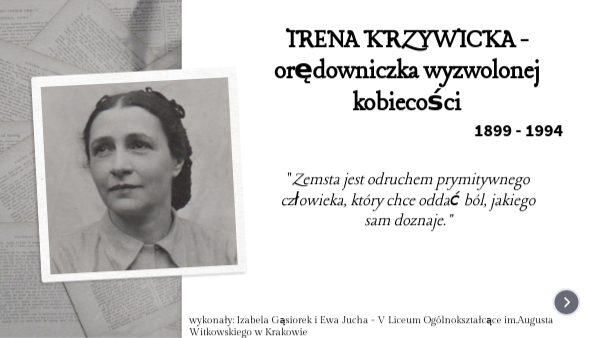Drogi graczu!Jest nam niezmiernie miło, że dotarłeś do końca. Mamy nadzieję, że udało nam się Ciebie zainteresować postacią Ireny Krzywickiej i ta prezentacja będzie tylko początkiem przygody z nią oraz innymi wartymi uwagi kobietami, o których niestety często się zapomina w dzisiejszych czasach. ~ Ewa i Izabela