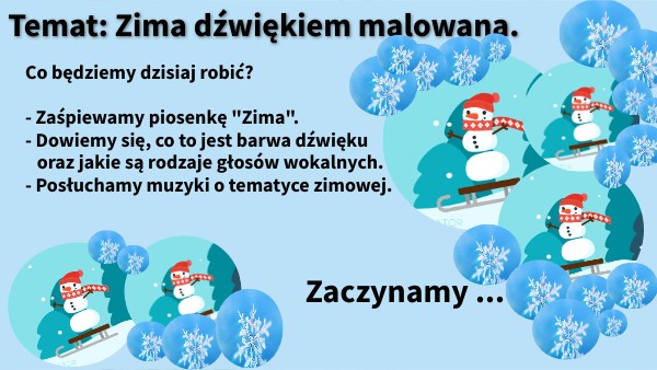 Co będziemy dzisiaj robić? - Zaśpiewamy piosenkę "Zima". - Dowiemy się, co to jest barwa dźwięku oraz jakie są rodzaje głosów wokalnych. - Posłuchamy muzyki o tematyce zimowej.