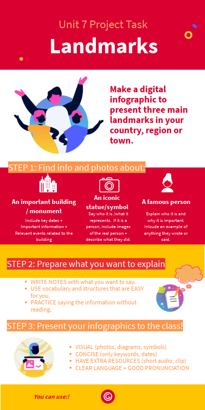 Make a digital infographic to present three main landmarks in your country, region or town.
